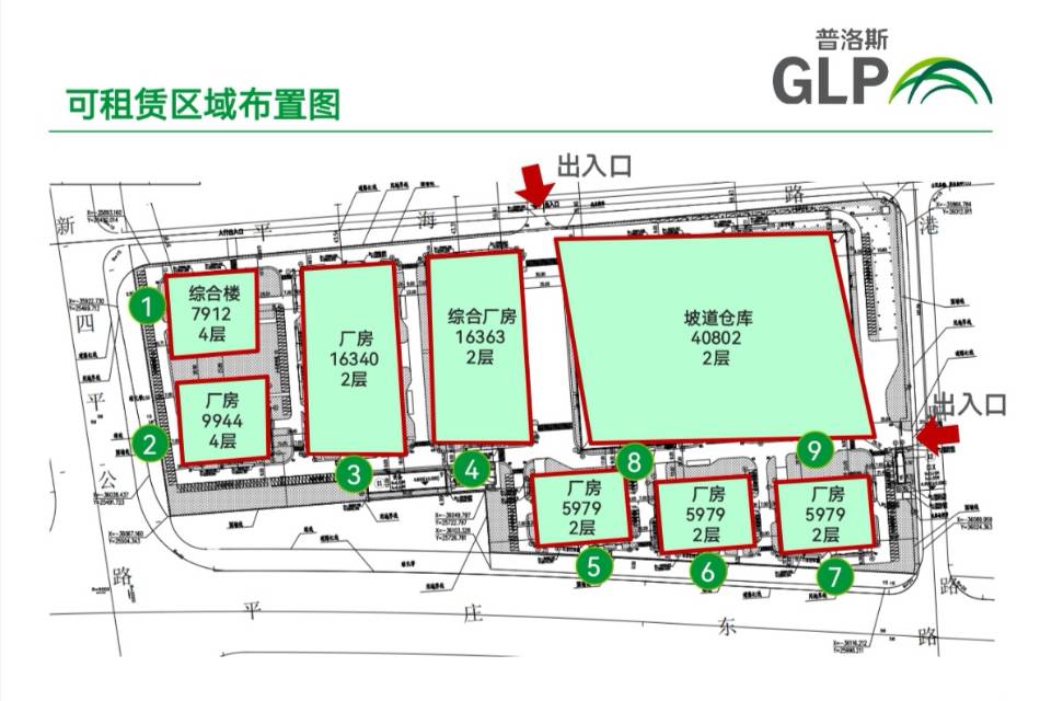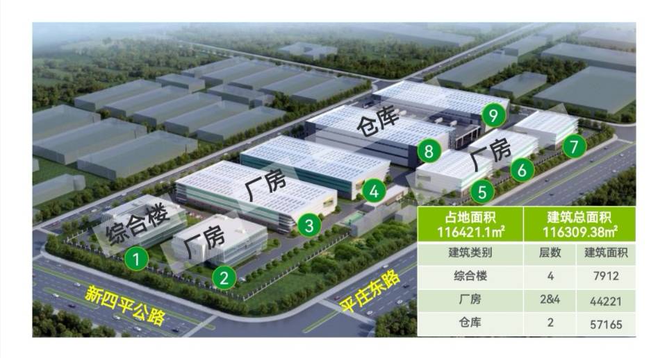 项目含综合楼1幢(4层,约7912m2),厂房5幢(规格不同),仓库1幢(2层,约16363),坡道仓库1幢(2层,约40802)。
