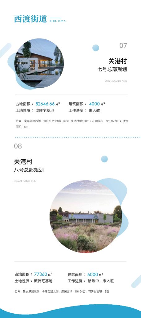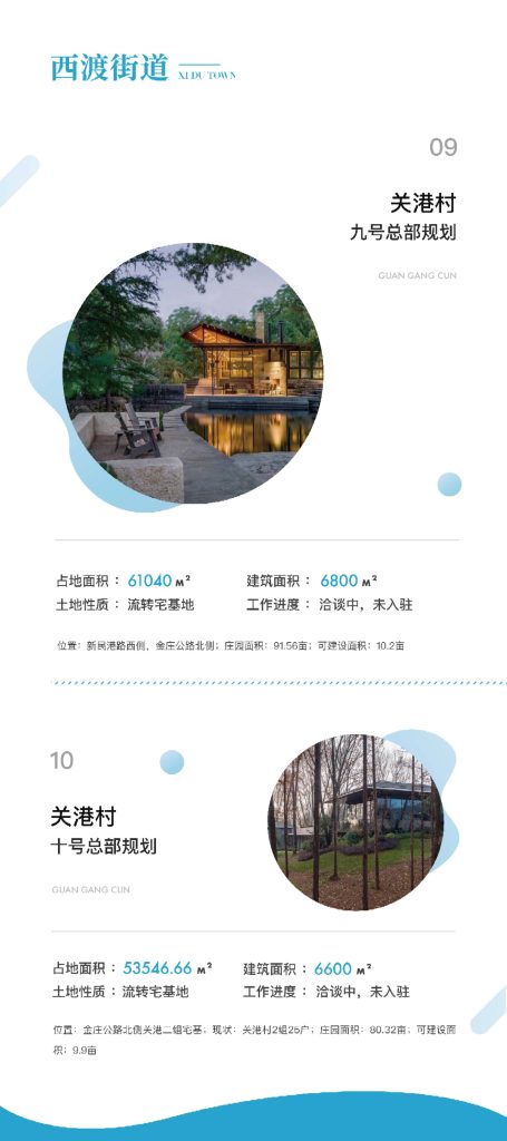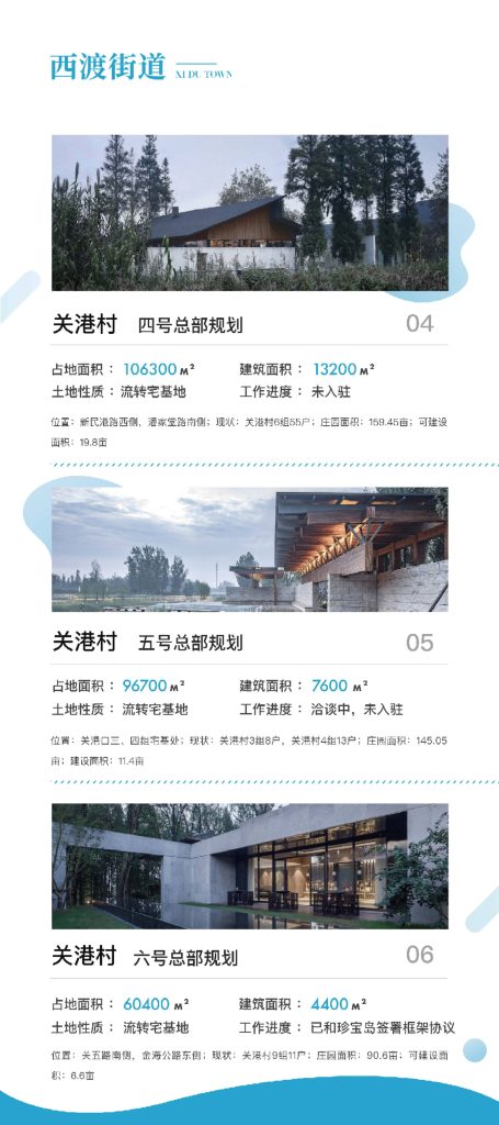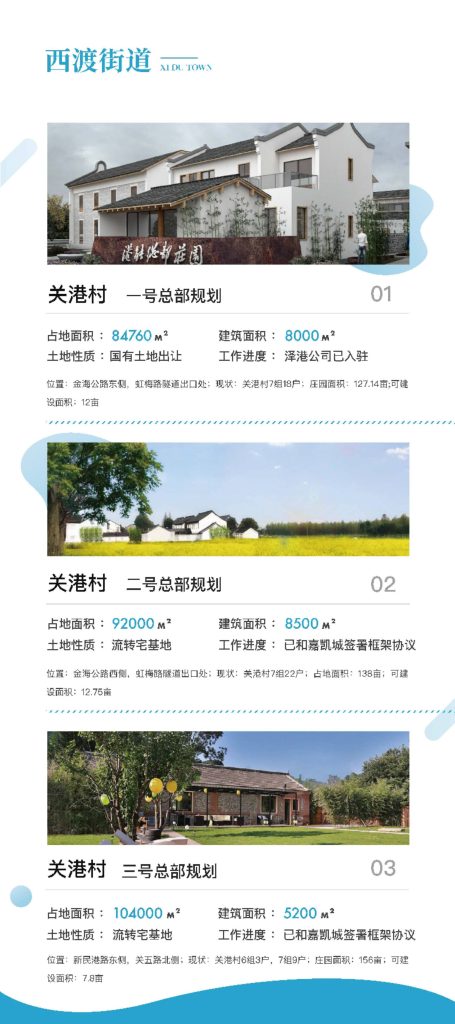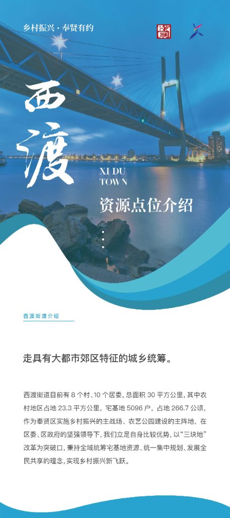 西渡街道积极响应奉贤区乡村振兴的号召,在黄浦江南岸打造总面积50平方公里的农艺公园示范区,西渡街道作为上海市实现乡村振兴的桥头堡,聚焦关港、五宅两个行政村4.4平方公里核心区域,依托上海国际大都市的背景,践行东方美谷战略,将都市的艺术时尚与乡村要素结合,以打造“三园一总部”为载体,引进工商资本,植入城市文明,形成乡村生态商务区,走具有大都市郊区特征的城乡统筹,实现共生发展。