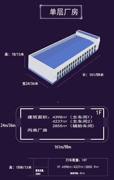 该项目占地80亩,一期建筑已经竣工验收,3栋单层厂房,一栋综合楼,配备员工食堂和宿舍。